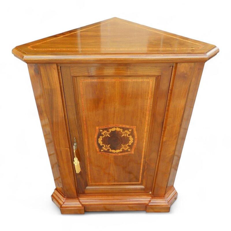 Questa elegante angoliera cantonale classica con intarsi è un'aggiunta di stile a qualsiasi ambiente. Realizzata in legno massiccio di alta qualità, questa angoliera presenta una porta intarsiata con un motivo a diamante centrale e dettagli floreali. I bordi smussati e le finiture lisce aggiungono un tocco di raffinatezza. Con le sue linee pulite e il design tradizionale, questa angoliera si adatta perfettamente a qualsiasi arredamento classico. Misurando circa 110 cm di altezza e 60 cm di larghezza, offre spazio sufficiente per riporre oggetti decorativi o utili. Un'opera d'artigianato di alta qualità, questa angoliera è un investimento duraturo per la tua casa.
