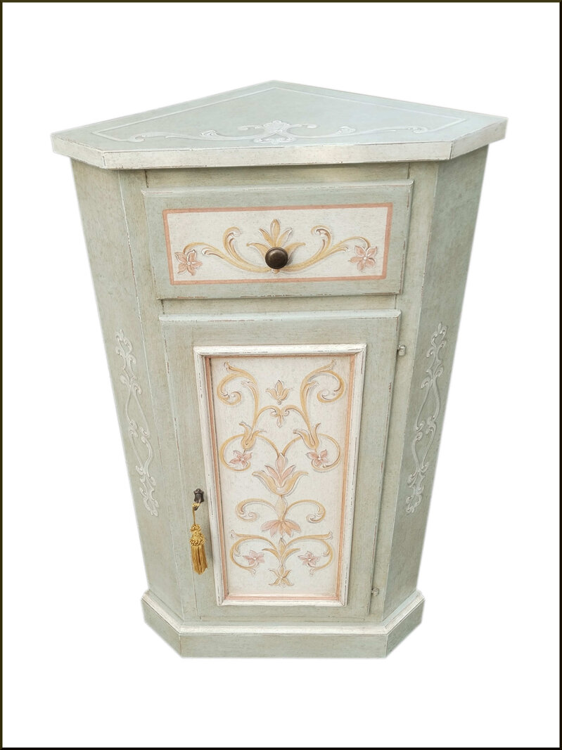 Questa elegante angoliera dipinta in stile provenzale è un pezzo di arredamento unico e raffinato che aggiungerà un tocco di charme alla tua casa. Realizzata artigianalmente con cura e attenzione ai dettagli, questa angoliera presenta un design intricato con motivi floreali e arabeschi dipinti a mano in tonalità delicate di rosa e oro su uno sfondo verde salvia. La finitura leggermente sbiadita le conferisce un'atmosfera vintage e romantica che si adatta perfettamente a uno stile provenzale. Con il suo spazio interno ampio e la porta decorata, questa angoliera offre un'opzione di archiviazione elegante e funzionale per qualsiasi ambiente. Puoi personalizzarla secondo le tue preferenze di dimensioni e colori per adattarla al tuo arredamento. Un pezzo di qualità artigianale che catturerà l'attenzione e aggiungerà un tocco di fascino senza tempo alla tua casa.