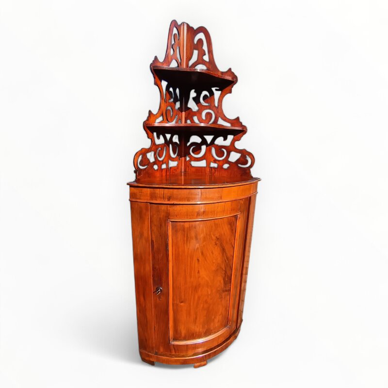Questa elegante angoliera cantonale antica con intagli è un'aggiunta di stile a qualsiasi ambiente. Realizzata in legno di noce di alta qualità, questa presenta una porta a pannello bombato con un motivo a traforato nella parte superiore e dettagli floreali. I bordi bombati e le finiture lisce aggiungono un tocco di raffinatezza. Con le sue linee pulite e il design tradizionale, questa angoliera si adatta perfettamente a qualsiasi arredamento classico. Misurando circa 170 cm di altezza e 45cm di lato, offre spazio sufficiente per riporre oggetti decorativi o utili. Un'opera d'artigianato di alta qualità, questa angoliera è un investimento duraturo per la tua casa.
