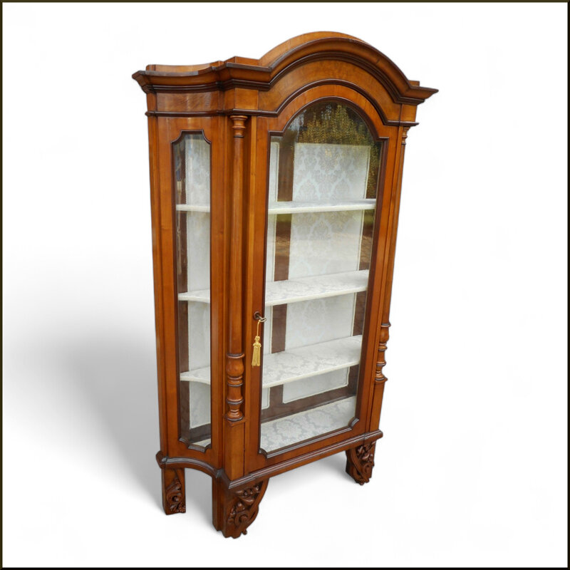 Questa antica vetrina dell'800 lombarda è un vero gioiello di artigianato italiano. Realizzata in legno massello con gli intagli finemente decorati, questa vetrina presenta un design arcuato elegante e dettagli scolpiti a mano che le conferiscono un fascino senza tempo. Le ante in vetro consentono di esporre con orgoglio i tuoi oggetti preziosi, mentre i ripiani interni offrono ampio spazio per conservare e organizzare i tuoi tesori. Un pezzo di antiquariato di alta qualità che aggiunge un tocco di classe e raffinatezza a qualsiasi ambiente.