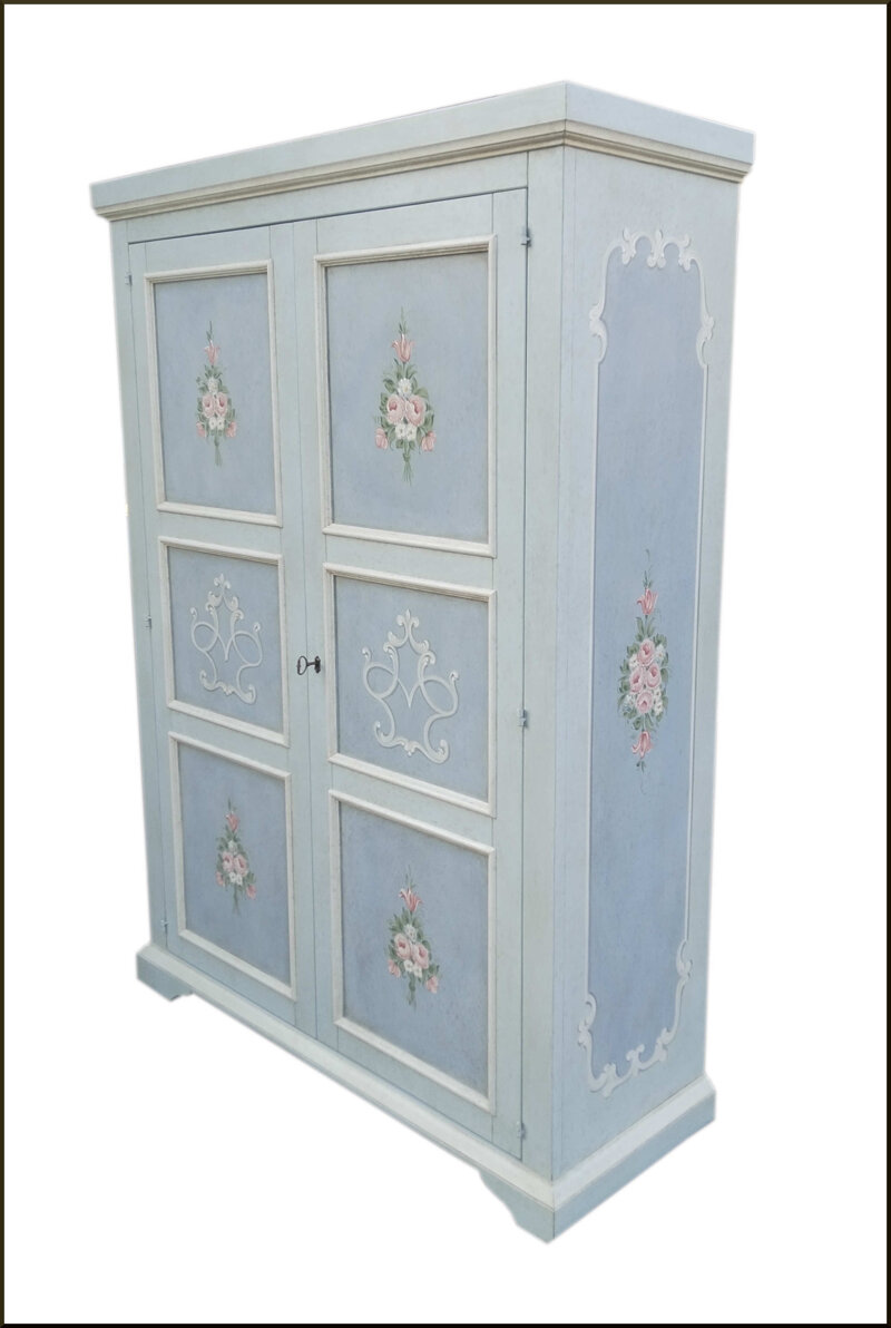 Questo armadio dispensa di due ante è un vero gioiello di artigianato. Dipinto e decorato a mano con splendidi motivi floreali e dettagli ornamentali, è un pezzo unico che aggiunge un tocco di eleganza e charme a qualsiasi ambiente. Le ante sono sapientemente decorate con fiori rosa e dettagli in rilievo che creano un effetto tridimensionale, mentre la struttura in legno massello è stata dipinta di un delicato azzurro cielo. Un mobile di grande pregio, ideale per conservare oggetti di valore o semplicemente per abbellire la casa con un tocco di raffinatezza senza tempo. Dimensioni e materiali devono essere verificati prima dell'acquisto.