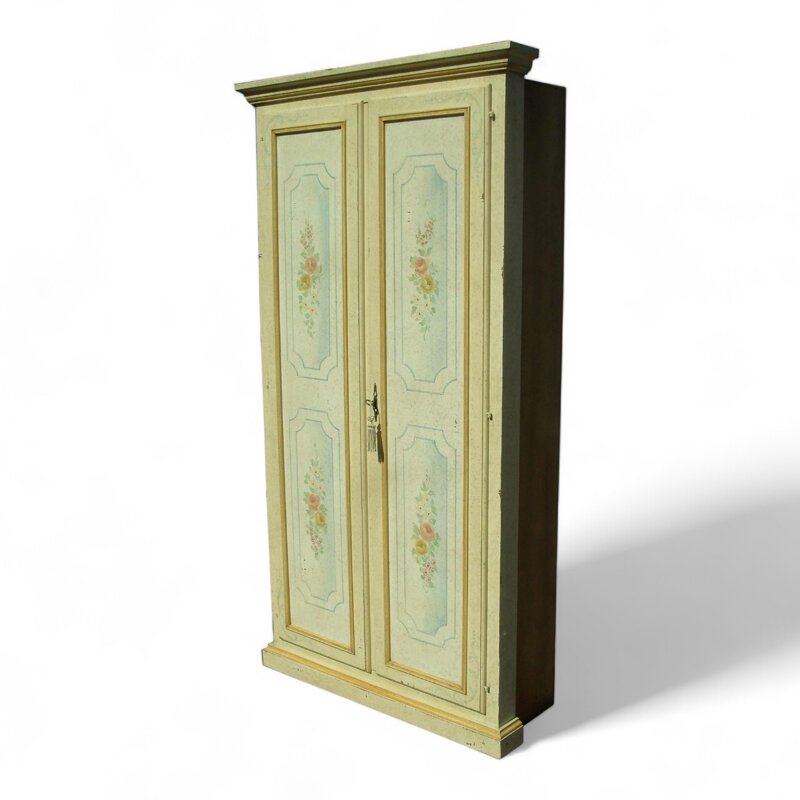Questo armadio dispensa realizzato per una nicchia è un pezzo di arredamento di grande fascino. Le ante dipinte a mano con delicati motivi floreali gli conferiscono un tocco di eleganza senza tempo. Realizzato con materiali di qualità, questo armadio offre un ampio spazio per riporre oggetti e provviste in modo ordinato. Le sue dimensioni compatte lo rendono ideale per essere inserito in una nicchia o in uno spazio ristretto, ottimizzando lo spazio disponibile. Un vero gioiello per la vostra casa, capace di unire funzionalità e bellezza in un unico mobile.