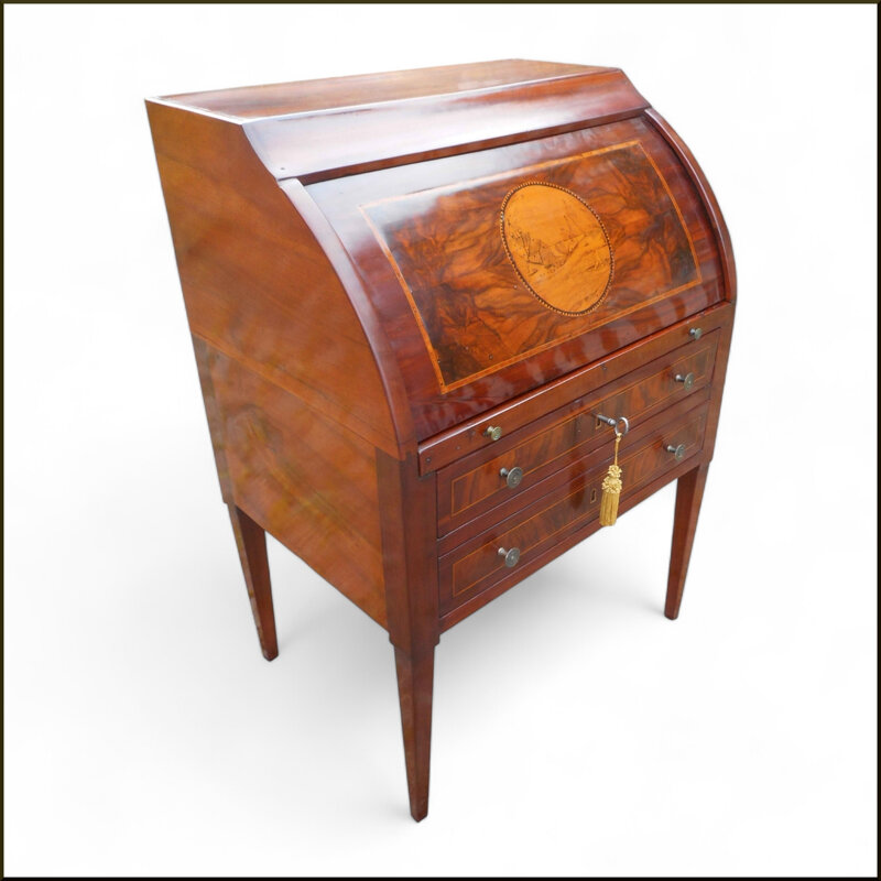 Questo elegante scrittoio a ribalta è un vero gioiello di artigianato in legno. La sua struttura in legno massello di noce presenta intarsi finemente lavorati che decorano il coperchio superiore, aggiungendo un tocco di raffinatezza. Dotato di cassetti e scomparti, offre ampio spazio per riporre documenti e cancelleria. Le gambe sottili e affusolate conferiscono un'aria di leggerezza a questo mobile, che si adatta perfettamente a uno studio o una biblioteca. Un pezzo d'antiquariato di alta qualità, realizzato con maestria artigianale per durare nel tempo.