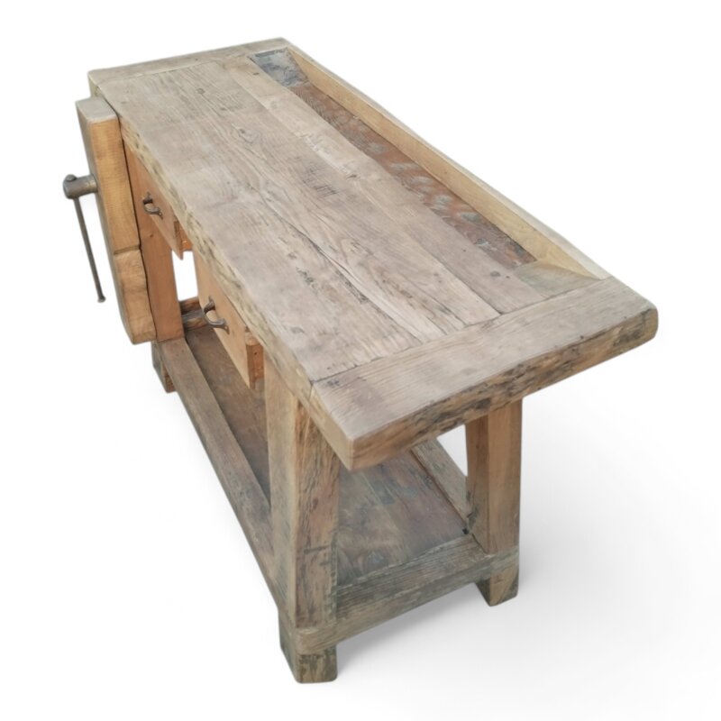 Questo banco da lavoro in rovere antico è un vero gioiello artigianale. La sua struttura robusta in legno massiccio lo rende perfetto per qualsiasi progetto di falegnameria o bricolage. Le due cassettiere laterali offrono un comodo spazio per riporre gli attrezzi e i piccoli accessori. La superficie ampia e resistente consente di lavorare comodamente su pezzi di grandi dimensioni. Un vero must per gli appassionati del fai da te, che apprezzeranno l'eleganza del design rustico e la funzionalità di questo mobile. Un investimento duraturo che abbellirà il vostro laboratorio artigianale per anni a venire.