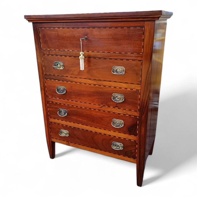 Questa piccola cassettiera in noce massello è un pezzo di arredamento elegante e funzionale. Realizzata in legno massiccio di alta qualità, presenta un design intarsiato che le conferisce un tocco di raffinatezza. Con i suoi cinque cassetti offre ampio spazio per riporre oggetti di uso quotidiano in modo ordinato. Le maniglie in metallo aggiungono un tocco di stile, mentre i piedini a forma piramidale le donano un'aria classica. Perfetta per l'ingresso o la camera da letto, questa cassettiera combina armoniosamente praticità e bellezza. Le dimensioni compatte la rendono adatta anche agli spazi più piccoli. Un mobile durevole e di qualità artigianale, ideale per aggiungere un tocco di eleganza alla vostra casa.