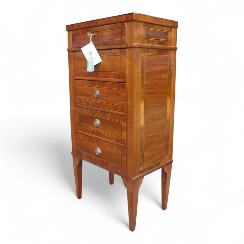 Questa cassettiera in legno di noce lucido risalente in stile Luigi XVI è un vero gioiello di artigianato. La struttura solida e ben costruita, con i suoi cassetti , offre un'ampia capacità di archiviazione per qualsiasi ambiente. Le linee eleganti e i dettagli decorativi ne fanno un pezzo da collezione, perfetto per arredare con stile e raffinatezza. Le dimensioni compatte la rendono adatta anche a spazi più piccoli. Un investimento duraturo che aggiungerà un tocco di classe senza tempo a qualsiasi stanza.