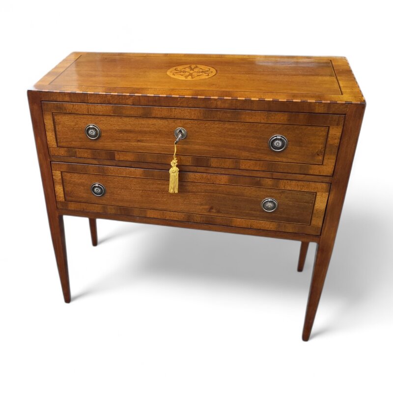 Questo comò d'ingresso in legno massiccio è un pezzo di artigianato di alta qualità. La sua struttura robusta e le linee eleganti lo rendono un'aggiunta perfetta a qualsiasi ambiente domestico. I quattro ampi cassetti offrono molto spazio per riporre oggetti e accessori, mentre il piano superiore intarsiato aggiunge un tocco di raffinatezza. Con le sue maniglie in metallo e la finitura lucida, questo comò cattura l'essenza del design classico italiano. Un'ottima scelta per chi cerca un arredo durevole e di stile.