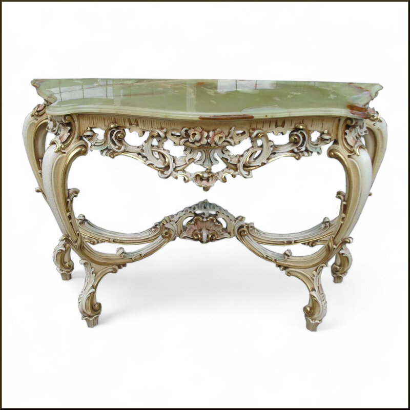 Questa elegante consolle con specchiera laccata in stile veneziano del 700 è un vero gioiello di artigianato. Il piano in onice pregiato aggiunge un tocco di raffinatezza, mentre le elaborate decorazioni intagliate a mano conferiscono un'atmosfera regale. Un pezzo da collezione che catturerà l'attenzione in qualsiasi ambiente grazie alla sua bellezza senza tempo. Perfetta per arredare un ingresso o un corridoio con stile e classe.