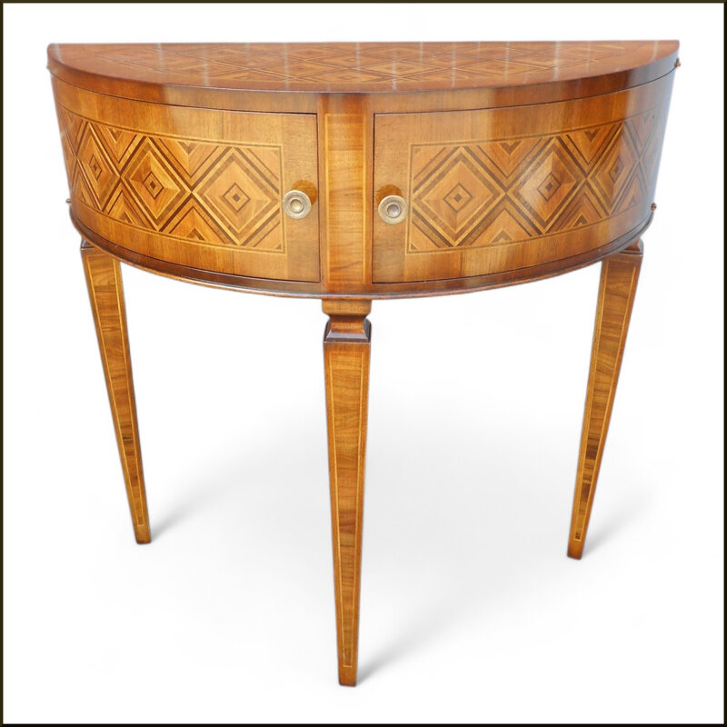 Questa elegante consolle demilune lastronata a mano è un'opera d'arte in legno massiccio. Il design curvilineo e l'intricato intarsio geometrico creano un pezzo unico e affascinante che arricchirà qualsiasi ambiente. Le ante con maniglie in metallo aggiungono un tocco di stile, mentre i piedini scolpiti conferiscono un'eleganza senza tempo. Un arredo prezioso che combina artigianalità e funzionalità, perfetto per esporre oggetti di valore o semplicemente ammirarne la bellezza. Un investimento duraturo che valorizzerà la tua casa con un tocco di lusso italiano.