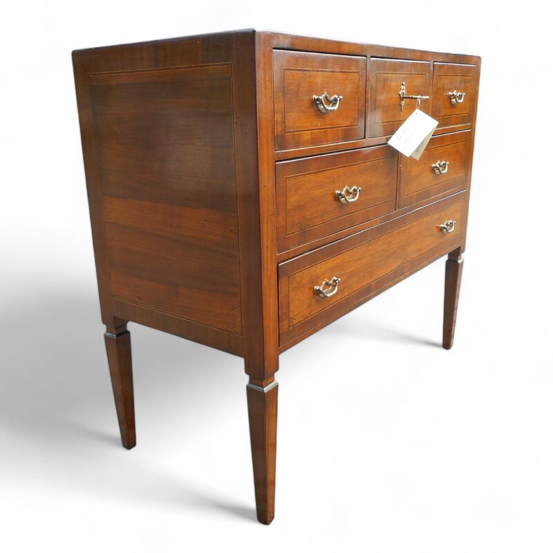 Questo elegante e raffinato comò in stile Luigi XVI è un vero gioiello per qualsiasi stanza. Realizzato artigianalmente in legno massiccio di alta qualità, presenta un design intramontabile con linee pulite e dettagli decorativi in metallo cesellato a mano. Ogni cassetto è rifinito con cura e scorre dolcemente sulle guide, offrendo ampio spazio per riporre i vostri oggetti preziosi. Le gambe sottili e affusolate conferiscono un'aria di leggerezza e grazia a questo mobile di lusso. Un pezzo da collezione che arricchirà l'arredamento della vostra casa con un tocco di eleganza senza tempo.