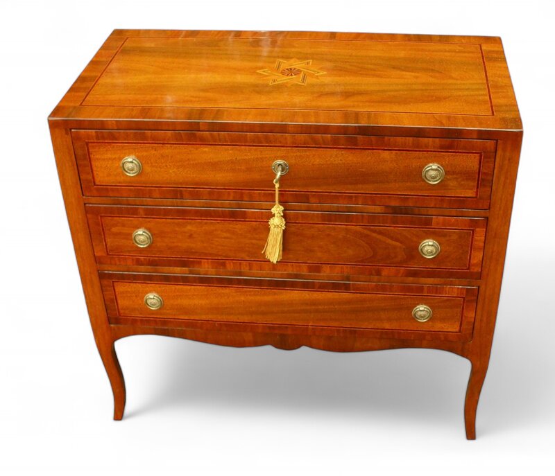 Questo elegante comoncino è un gioiello di artigianato in legno. Il suo design classico con cassetti sagomati e pomelli in ottone lo rende un pezzo d'arredamento versatile e di grande impatto visivo. La finitura in legno di noce lucidato a mano conferisce un tocco di calore e ricchezza a qualsiasi ambiente. Con le sue linee sinuose e la decorazione intarsiata sul piano superiore, questo comò è un'aggiunta raffinata e funzionale a qualsiasi casa. Le dimensioni compatte lo rendono ideale per ingressi, corridoi o camere da letto. Un vero tesoro da tramandare di generazione in generazione.