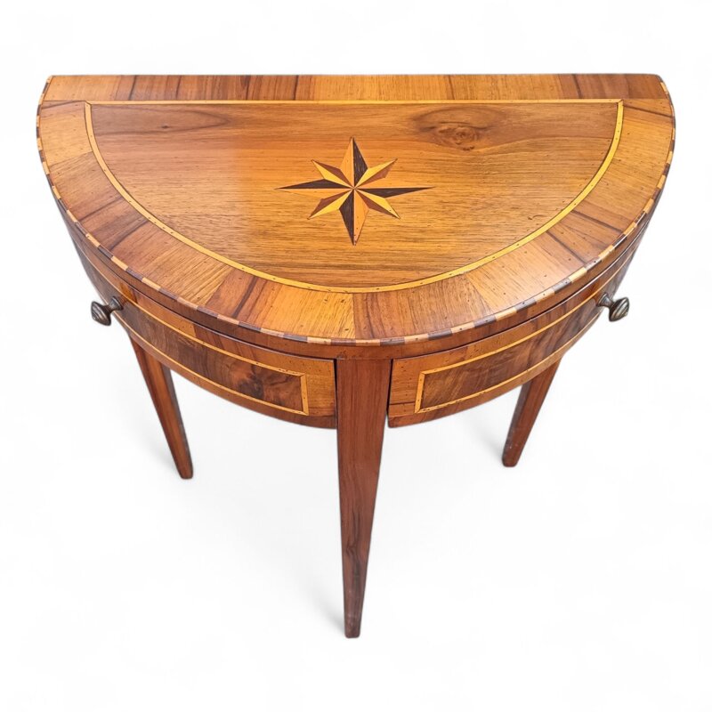 Questa consolle demilune artigianale da ingresso è un gioiello di artigianalità e design. Il suo aspetto elegante e la sua forma semicircolare la rendono un pezzo d'arredo perfetto per arricchire l'ingresso di casa. Realizzata in legno massiccio di alta qualità, questa consolle è stata sapientemente lavorata a mano da artigiani esperti per garantire una finitura impeccabile e una lunga durata. La sua linea sinuosa e i cassetti integrati ed una particolare apertura offrono un tocco di stile e praticità. Dalle dimensioni compatte, questa consolle demilune si adatta facilmente a spazi ristretti, valorizzando l'ambiente con la sua presenza raffinata. Un vero capolavoro di design e artigianalità italiana.
