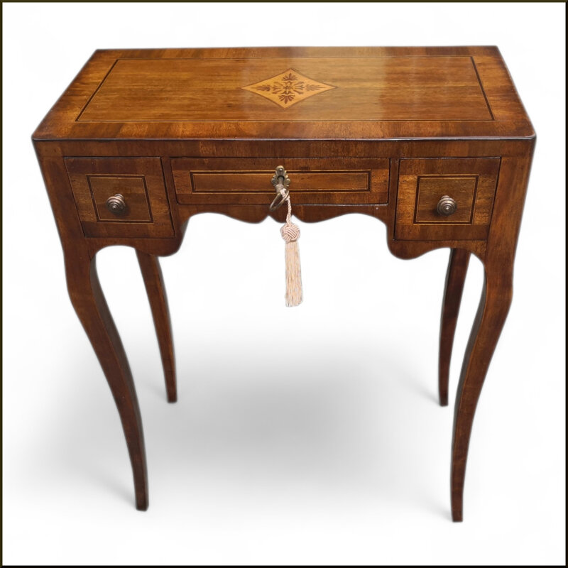 Questa elegante piccola consolle da ingresso in legno massiccio è un'aggiunta raffinata per l'arredamento di casa. Realizzata artigianalmente con cura, presenta un piano lastronato con un motivo decorativo intarsiato e cassetti con pomelli decorati. Le linee pulite e le gambe affusolate conferiscono un tocco di stile tradizionale. Questa consolle versatile offre spazio per riporre oggetti e aggiunge un tocco di fascino all'ingresso o al corridoio. Un pezzo di arredamento durevole e ben costruito che esalta l'estetica di qualsiasi ambiente.