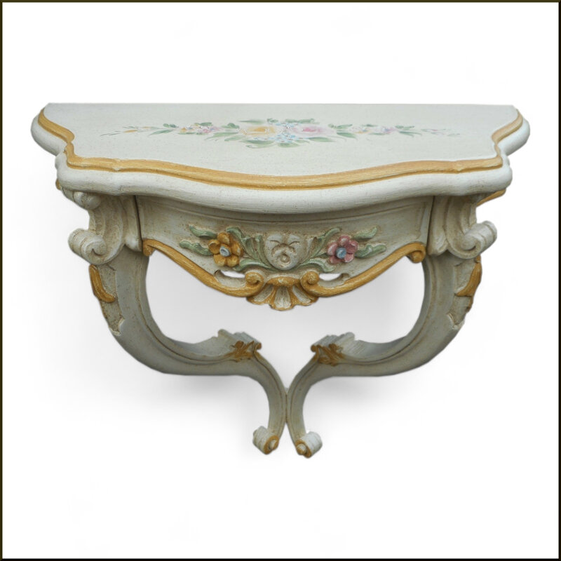 Questa piccola consolle dipinta a mano è un'opera d'arte raffinata che aggiungerà un tocco di eleganza al tuo arredamento. Realizzata con materiali di alta qualità, presenta un design ricco di dettagli decorativi floreali e motivi ornamentali in rilievo. Le tonalità delicate e i tocchi dorati creano un'atmosfera calda e accogliente. Questa consolle è perfetta per essere appesa a parete, offrendo uno spazio funzionale per esporre oggetti decorativi o semplicemente per aggiungere un elemento di design unico. Un pezzo da collezione che catturerà l'attenzione e sarà ammirato da tutti i tuoi ospiti.