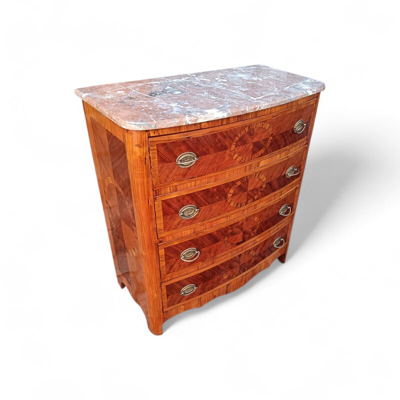 Questo cassettone in stile è un pezzo di arredamento di grande fascino. Realizzato in mogano e legno di rosa di pregiata qualità, presenta un piano in marmo che mette in risalto le venature naturali del legno. La struttura robusta e le linee eleganti sapientemente arricchite da eleganti giochi di tarsie lo rendono un complemento d'arredo perfetto per un ambiente classico e raffinato. Dotato di ampi cassetti , offre un'ottima capacità di contenimento per riporre con ordine oggetti e indumenti. Un mobile di grande valore estetico e funzionale, ideale per arricchire con stile la tua casa.