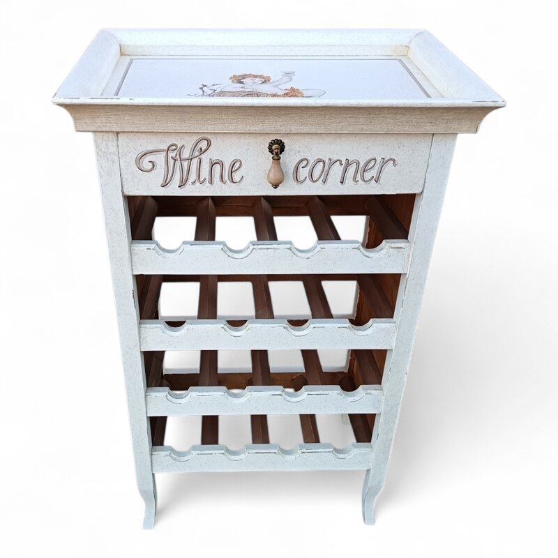 Questo mobiletto portabottiglie dipinto in stile provenzale aggiunge un tocco di eleganza rustica a qualsiasi stanza. La finitura vintage con dettagli floreali e motivi decorativi dona un'atmosfera calda e accogliente. Il mobile è realizzato con materiali di qualità e una lavorazione artigianale che ne esalta la bellezza. Perfetto per conservare bottiglie o semplicemente come elemento d'arredo, questo mobiletto diventerà un pezzo da collezione nella vostra casa. Dimensioni compatte ma spaziose, facile da pulire e da spostare. Un gioiello di artigianato italiano per arredare con stile.