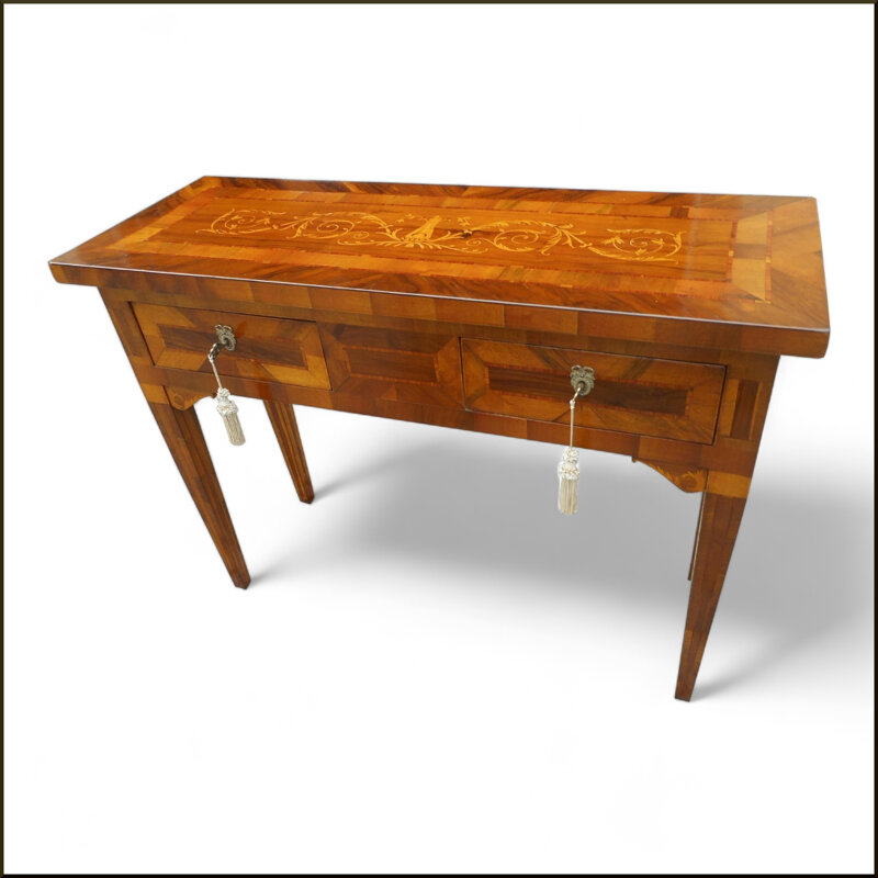 Questa elegante consolle classica intarsiata è un'aggiunta di stile e raffinatezza per qualsiasi ambiente. Realizzata artigianalmente in legno massello, presenta un design intarsiato a mano con motivi floreali che aggiungono un tocco di eleganza. I due cassetti offrono uno spazio di archiviazione pratico, mentre i piedini sottili conferiscono un aspetto leggero ed elegante. Questa consolle è un pezzo di arredamento di alta qualità che dura nel tempo, perfetto per creare un'atmosfera accogliente e sofisticata in casa tua.