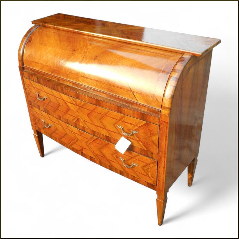 Questo mobile è un capolavoro di artigianato in legno. La cassettiera presenta intarsi geometrici intricati e dettagli decorativi in ottone che esaltano la bellezza del legno massiccio. Il design a rullo della parte superiore conferisce un tocco di eleganza e praticità. Perfetto per arredare con stile una casa classica, questo mobile è un gioiello di artigianalità che si adatta a qualsiasi ambiente. Un investimento duraturo che aggiungerà un tocco di classe alla tua casa.