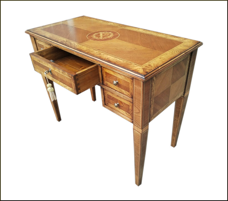 Questo scrittoio classico artigianale da centro è un pezzo di arredamento di alta qualità, realizzato con cura e attenzione ai dettagli. Il piano superiore presenta un'elegante intarsio che aggiunge un tocco di raffinatezza e unicità. Le gambe sottili e la struttura in legno massello conferiscono solidità e stabilità. Gli ampi cassetti e lo scomparto a giorno offrono spazio per riporre oggetti e documenti importanti. Uno scrittoio di questo tipo è ideale per arricchire l'arredamento di un ufficio o studio, aggiungendo un tocco di stile classico e sofisticato. Le dimensioni compatte lo rendono adatto anche per spazi più piccoli. Un vero gioiello di artigianato per gli amanti dei mobili di pregio.