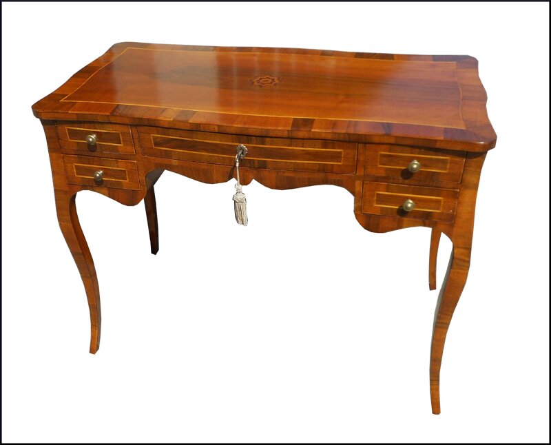 Questo scrittoio classico sagomato è un vero gioiello di artigianato. Realizzato a mano con legno pregiato, presenta un elegante design con cinque cassetti e una superficie lastronata per offrire ampio spazio di lavoro. Le linee sinuose e le finiture in legno lucido gli conferiscono un'estetica raffinata, perfetta per arredare con stile uno studio o un ufficio. Un mobile di qualità eccezionale, destinato a durare nel tempo e a impreziosire qualsiasi ambiente con la sua bellezza senza tempo.