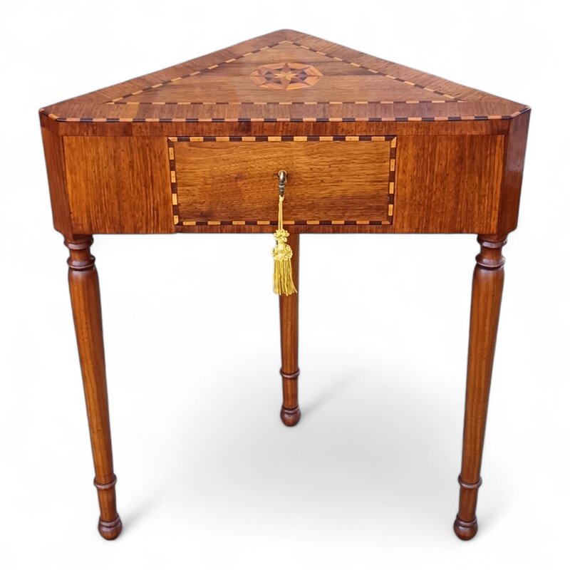 Questo elegante tavolino cantonale con intarsi è un'aggiunta di stile a qualsiasi ambiente. Realizzato in legno di noce di alta qualità, questa angoliera presenta una cassettino sapientemente intarsiato e sul piano un motivo centrale con stella. I bordi smussati e le finiture lisce aggiungono un tocco di raffinatezza. Con le sue linee pulite e il design tradizionale, questa angoliera si adatta perfettamente a qualsiasi arredamento classico. Misurando circa 78 cm di altezza e 46 di lato cm di lato, riempie quegli angoli di casa difficilmente arredabili..Un'opera d'artigianato di alta qualità, questa tavolino ad angolo è un investimento duraturo per la tua casa.