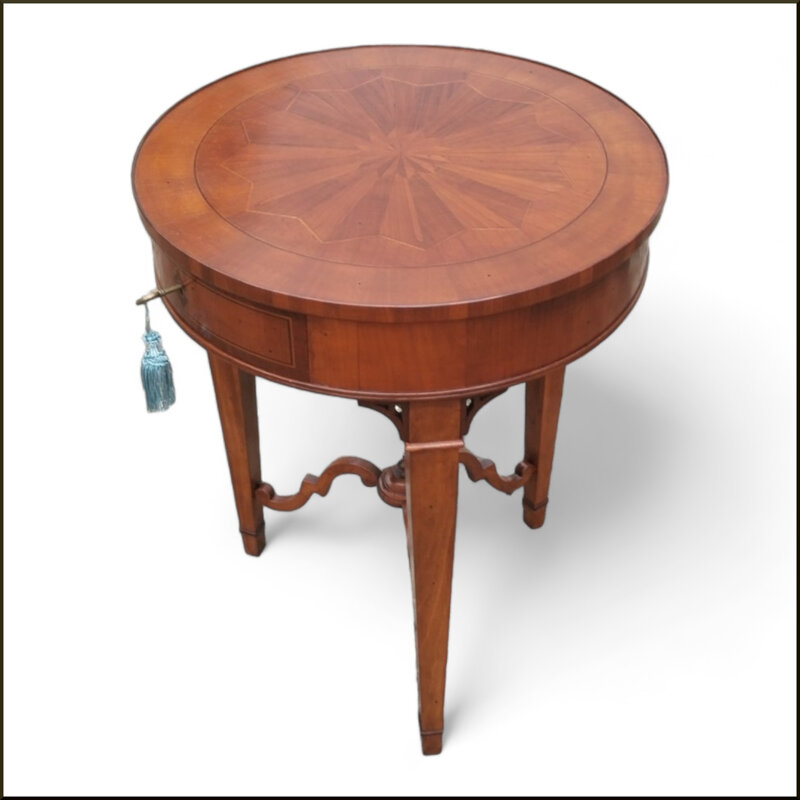 Questo elegante tavolino rotondo in stile classico è un'aggiunta raffinata a qualsiasi ambiente. Realizzato in legno massiccio, presenta un'incisione ornamentale sul piano superiore e un cassetto spazioso per riporre oggetti di piccole dimensioni. Le linee sinuose delle gambe conferiscono un tocco di grazia, mentre il pomello decorativo aggiunge un ulteriore dettaglio di charme. Un must per gli amanti dell'arredamento tradizionale, questo tavolino sarà un pezzo da esposizione nella tua casa.