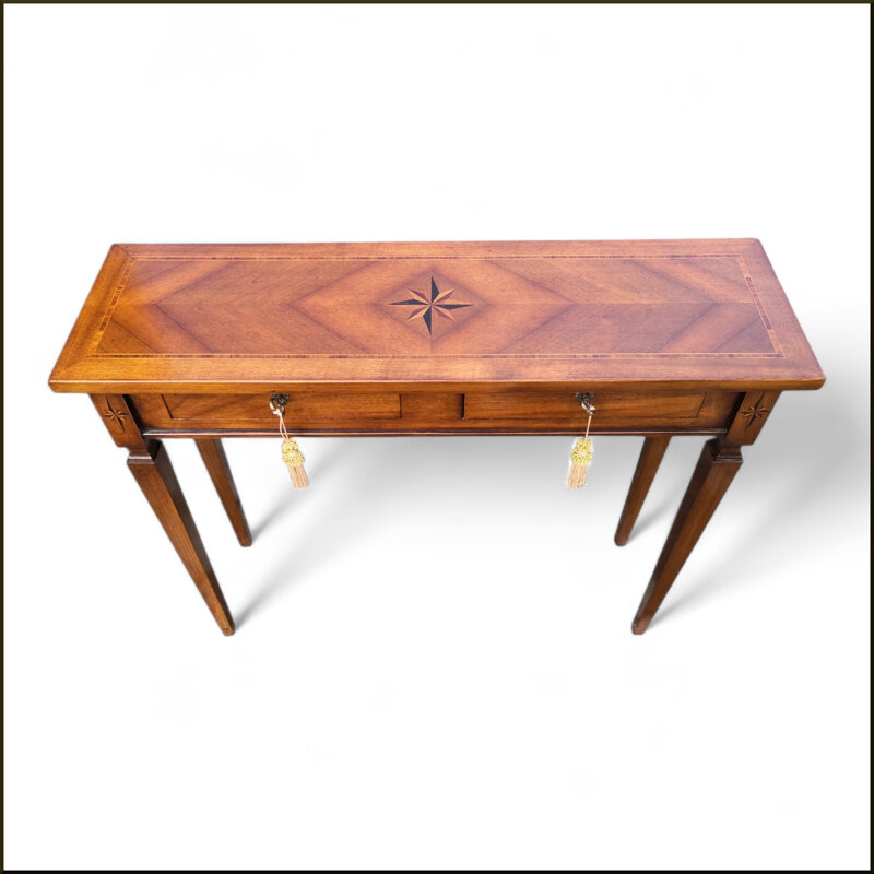 Questo tavolino consolle classico artigianale è un vero capolavoro di artigianalità e design. Realizzato in legno massiccio di alta qualità, presenta dettagli intarsiati a mano che gli conferiscono un aspetto elegante e raffinato. Le linee curve e le gambe sagomate donano a questo mobile un fascino senza tempo, mentre i cassetti offrono uno spazio di archiviazione funzionale. Un vero gioiello per arredare con stile la tua casa, questo tavolo da consolle è un pezzo unico che catturerà l'attenzione di chiunque lo ammiri. Acquistalo ora per aggiungere un tocco di classe ed eleganza al tuo arredamento.