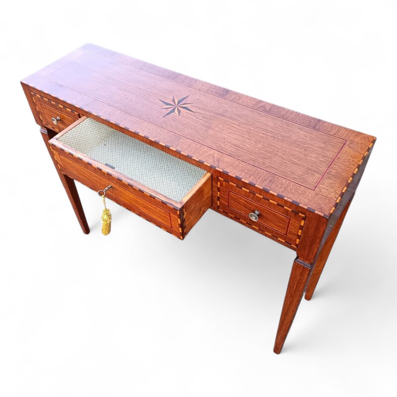 Questo tavolino consolle da ingresso artigianale è realizzato con estrema cura e attenzione ai dettagli. La sua struttura in legno massello è decorata con intarsi geometrici che conferiscono un tocco di eleganza e unicità. I tre cassetti offrono un'ampia capacità di stoccaggio per riporre oggetti di uso quotidiano. Le gambe sottili ma resistenti garantiscono stabilità e leggerezza. Un pezzo di arredamento versatile, adatto ad arricchire l'ingresso o il corridoio di qualsiasi abitazione con uno stile raffinato. È possibile richiedere misure personalizzate per adattarlo perfettamente al tuo spazio.