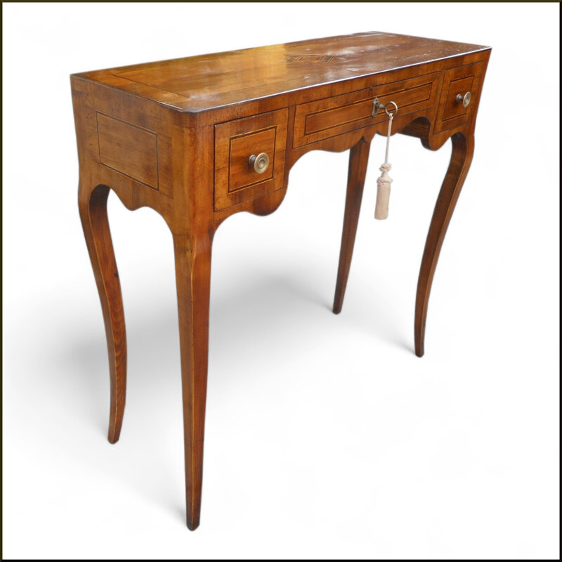 Questo elegante tavolino consolle da ingresso classica su misura è realizzato in legno pregiato e presenta un design raffinato con intarsi decorativi. Le sue linee armoniose e la finitura lucidata a mano lo rendono un pezzo d'arredo di grande fascino, ideale per valorizzare l'ingresso di casa. Dotato di cassetti spaziosi e di un'ampia superficie superiore, offre un'ottima funzionalità oltre alla bellezza estetica. I piedini sagomati conferiscono stabilità e un tocco di stile in più. Un mobile di qualità artigianale che si adatta perfettamente ad ambienti classici ed eleganti.