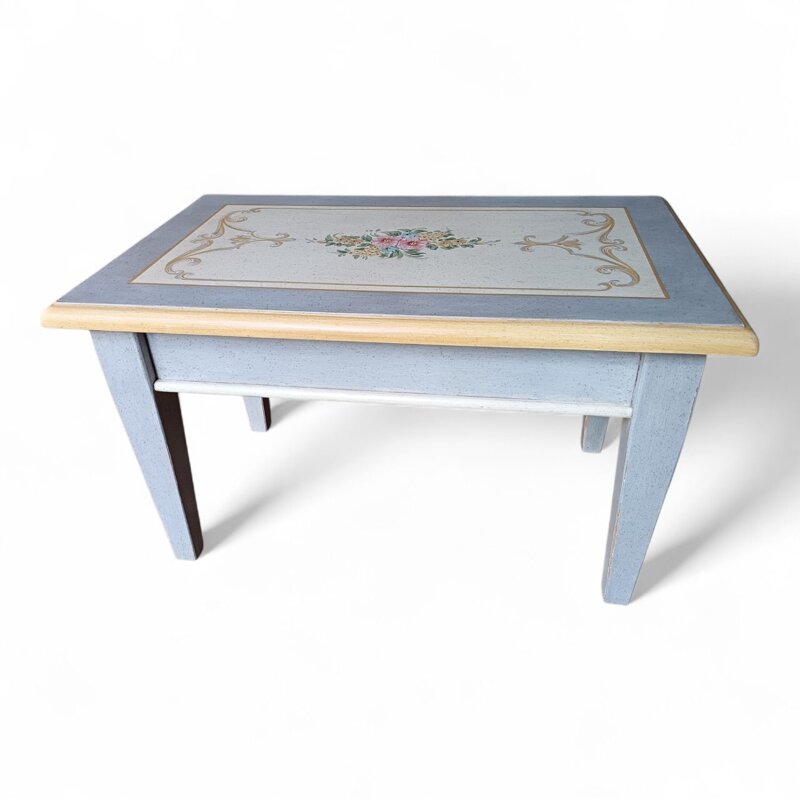 Questa piccolo tavolino da salotto è un vero gioiello artigianale. Il suo design rustico ma raffinato, con decorazioni floreali dipinte a mano, gli conferisce un fascino senza tempo. Il piano superiore può essere utilizzato come superficie d'appoggio. Un pezzo d'artigianato di grande pregio, perfetto per arredare con stile un ambiente classico o country. Realizzato con tecniche tradizionali, questa tavolino è un'autentica testimonianza dell'abilità artigiana italiana.