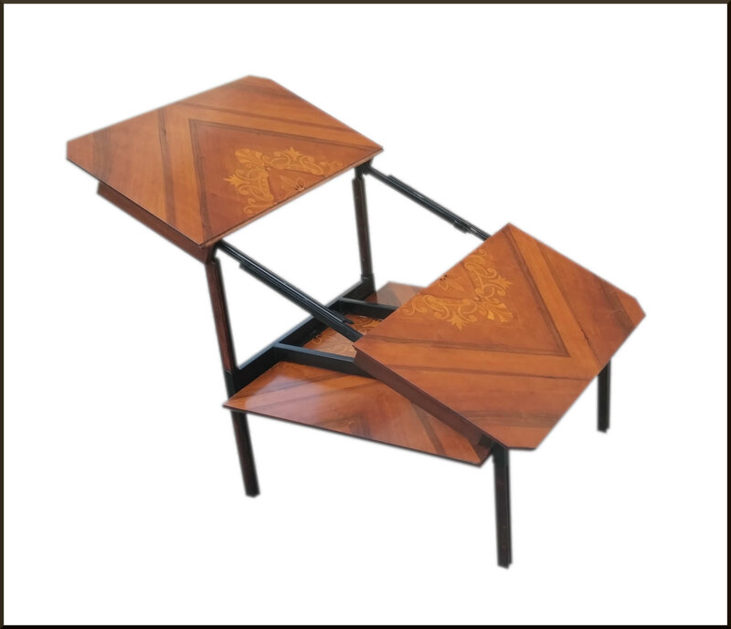 Questo tavolo da salotto trasformabile in tavolo da pranzo è un'aggiunta elegante e funzionale per qualsiasi ambiente domestico. La sua struttura in metallo robusto e il piano in legno massello di qualità superiore lo rendono un pezzo durevole e resistente. Il design intarsiato con motivi floreali sul piano conferisce un tocco di raffinatezza e artigianalità. Grazie alla sua forma pieghevole, può essere utilizzato come tavolino da salotto o come tavolo da pranzo, adattandosi alle vostre esigenze di spazio. Un pezzo di arredamento versatile e di grande impatto visivo per arricchire qualsiasi stanza con stile e funzionalità.