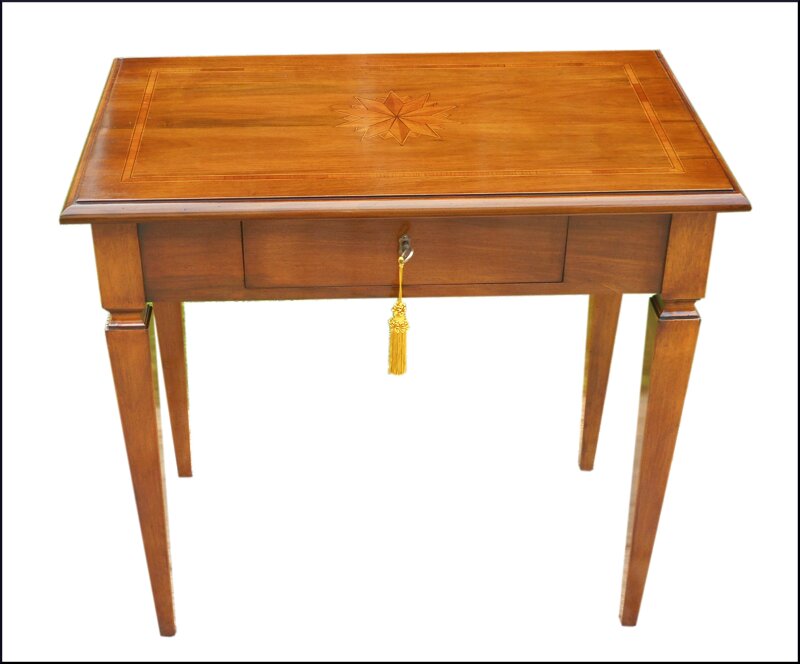 Questo elegante tavolino scrittoio in stile 'Impero è un'opera d'arte realizzata in noce massello. L'intarsio raffinato aggiunge un tocco di classe e distinzione a questo pezzo di arredamento. Ideale per uno studio o una biblioteca, questo scrittoio trasmette un senso di tradizione e artigianalità. La sua struttura robusta in legno massiccio lo rende durevole e resistente, mentre le linee pulite e i dettagli intarsiati gli conferiscono un'eleganza senza tempo. Un vero gioiello per gli amanti dell'arredamento di qualità e del design classico. Le dimensioni compatte lo rendono adatto anche a spazi più piccoli. Un investimento che aggiungerà valore ed eleganza a qualsiasi ambiente.