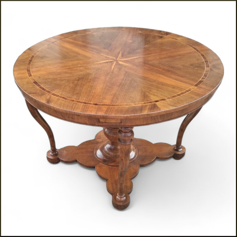 Questo tavolo a cestello emiliano in noce è un pezzo di artigianato di alta qualità. Il piano circolare è realizzato in legno di noce massiccio con un bellissimo intarsio a forma di stella al centro. La base è scolpita a mano con dettagli elaborati e piedini torniti che conferiscono un aspetto elegante. Questo tavolo aggiunge un tocco di classe e tradizione a qualsiasi ambiente. Le dimensioni generose lo rendono perfetto per sale da pranzo o soggiorni. Un arredo di lusso che diventerà un pezzo centrale della tua casa per anni a venire.