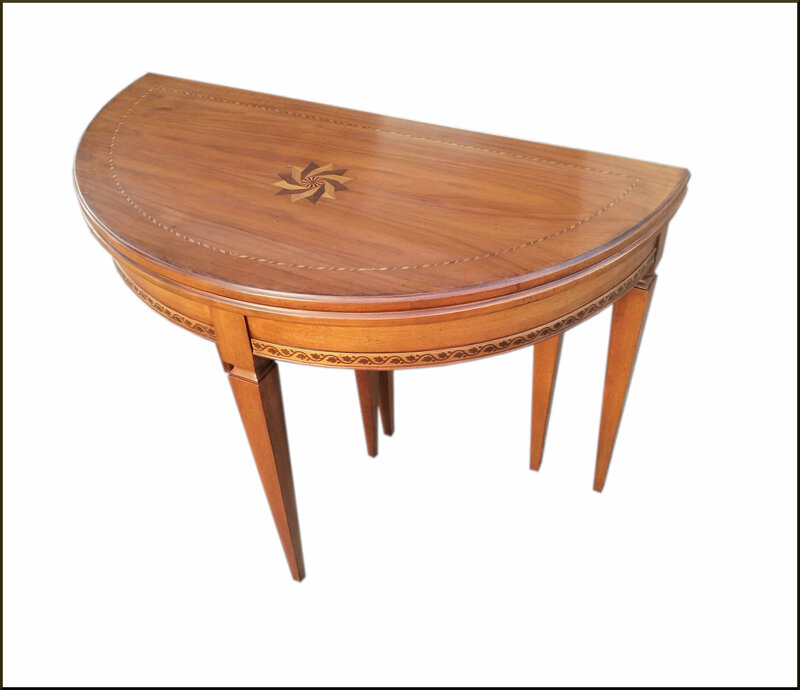 Il tavolo consolle a mezzaluna è un complemento d'arredo versatile e di grande eleganza. Grazie al suo design intarsiato, questo tavolo non solo è funzionale, ma diventa anche un vero e proprio pezzo d'arte da esposizione. La sua forma a mezzaluna permette di sfruttare al meglio gli spazi, rendendolo ideale per ingressi, corridoi o anche come tavolo da soggiorno.