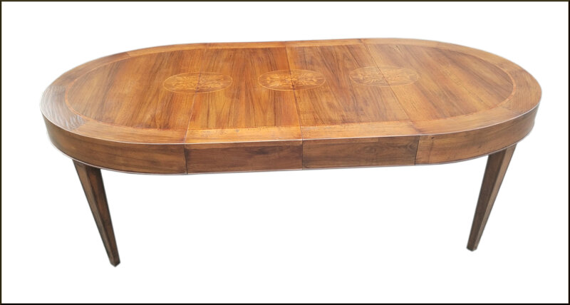 Questo tavolo ovale allungabile in legno massello è un gioiello di artigianato. Realizzato con cura artigianale, presenta un'elegante finitura intarsiata sulla superficie e una gamba impero scanalata che gli conferisce un tocco di classe. Le prolunghe integrate consentono di aumentare facilmente la dimensione del tavolo per adattarsi alle tue esigenze di spazio. Un pezzo di arredamento funzionale e raffinato che aggiungerà un tocco di stile a qualsiasi ambiente.
