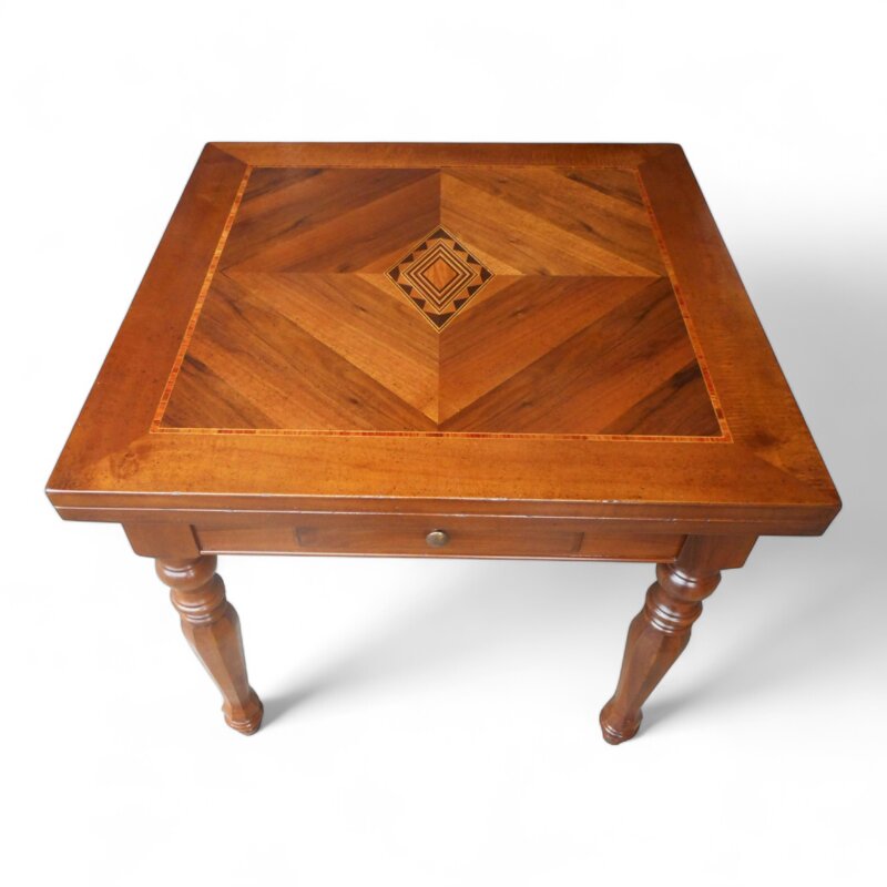 Questo tavolo quadrato classico di 90x90 cm è un'opera d'arte di artigianato in legno. La sua superficie intarsiata con un motivo a diamante al centro crea un effetto visivo sorprendente. Le gambe tornite aggiungono un tocco di eleganza, mentre il cassetto offre uno spazio di archiviazione pratico. Realizzato con legno pregiato, questo tavolo è un pezzo robusto e durevole, ideale per arredare la tua casa con un tocco di stile tradizionale. La sua bellezza senza tempo lo renderà un complemento d'arredo prezioso per gli anni a venire.