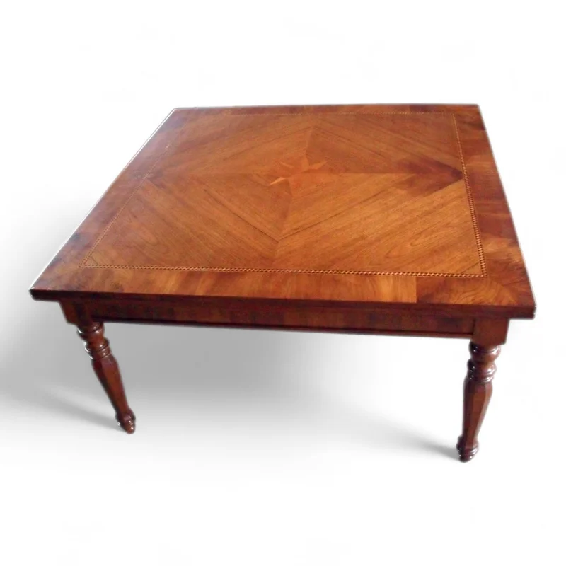 Questo tavolo quadrato in legno massiccio è un pezzo di artigianato eccezionale. Realizzato con meticolose tecniche di intarsio, presenta un elegante disegno geometrico al centro del piano. Le gambe tornite e i dettagli intagliati aggiungono un tocco di raffinatezza. Allungabile fino a 250 x 150 cm, è perfetto per accogliere ospiti durante le feste. Un'aggiunta di classe al tuo arredamento, questo tavolo quadrato su misura trasuda stile e qualità artigianale.