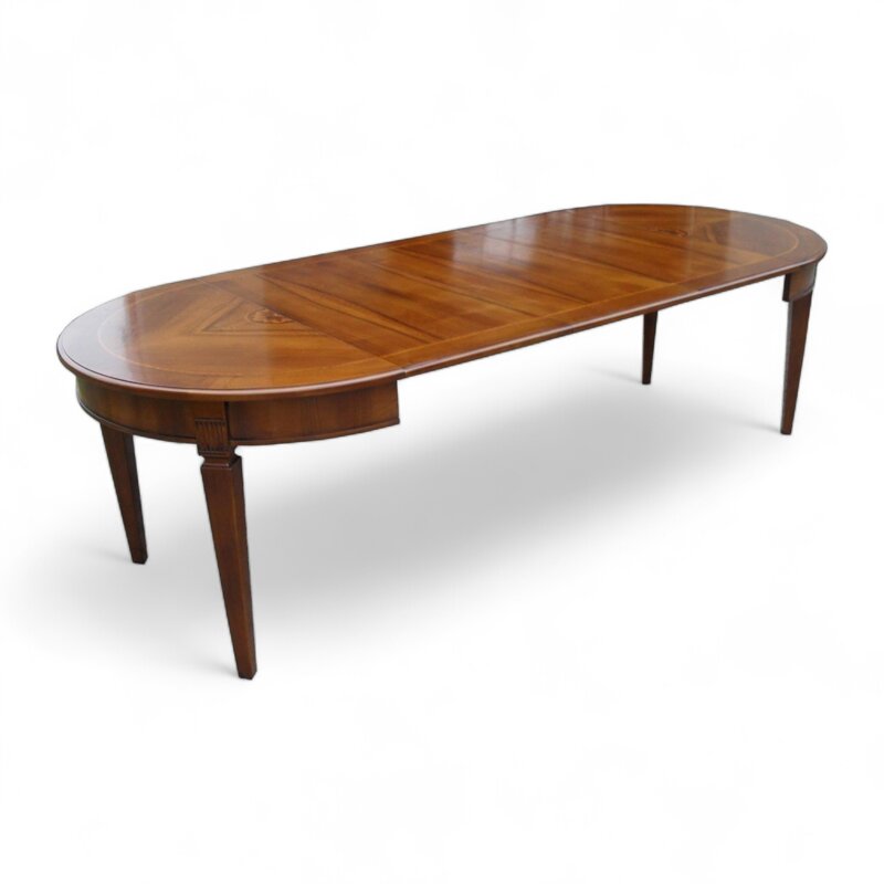 Questo tavolo allungabile di legno massiccio è un'opera d'arte artigianale di alta qualità. La sua forma rotonda elegante e le gambe piramidali scanalate lo rendono un pezzo da esposizione in qualsiasi sala da pranzo o salotto. Il piano in legno di noce anticato offre un'estetica accogliente e un'atmosfera calda. Questo tavolo versatile può ospitare comodamente fino a 10 persone quando esteso, rendendolo perfetto per cene e feste. Un investimento duraturo che aggiungerà un tocco di classe al tuo arredamento per anni a venire.