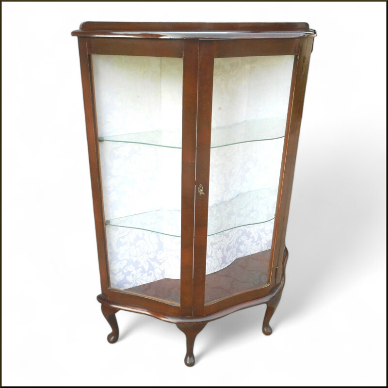 Questa vetrinetta inglese sagomata risalente all'inizio del 1900 è un pezzo di arredamento elegante e raffinato. La struttura in legno massiccio di colore marrone scuro presenta linee curve e dettagli ornamentali che le conferiscono un aspetto classico e tradizionale. Le ante in vetro trasparente permettono di esporre e ammirare gli oggetti al suo interno, mentre le gambe ricurve aggiungono un tocco di grazia. Perfetta per arredare un salotto o un ingresso, questa vetrinetta vintage è un'aggiunta di stile e fascino ad ogni ambiente.
